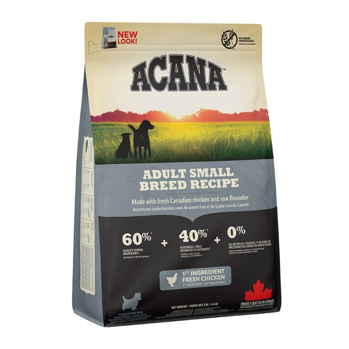 Πλήρης τροφή χωρίς σιτηρά με κοτόπουλο, γαλοπούλα, ρέγγα και καλκάνι, για ενήλικους σκύλους μικρόσωμων φυλών έως 10 κιλά. Με 60% ποιοτικά ζωικά συστατικά όπως καναδικό κοτόπουλο και ωμό καλκάνι, αλλά και 40% φρούτα, λαχανικά και βότανα,προσφέρει στον μικρόσωμο σκύλο σας την πρωτεΐνη και τη θρέψη που έχει ανάγκη για βέλτιστη και γρήγορη ανάπτυξη. Χαρακτηριστικά Με 60% ποιοτικά ζωικά συστατικά, 1/3 των οποίων είναι φρέσκα ή ωμά, από 3 διαφορετικές πηγές, πουλερικά, ψάρια, κόκκαλα όργαναnbsp; Πουλερικά, ψάρια, όργανα, χόνδροι οστά, παρέχουν θρεπτικά συστατικά στην πιο φυσική και θρεπτική τους μορφή Με φρέσκα ή ωμά λαχανικά, φρούτα και βόταναnbsp; Με εγχύσεις freezy-dry συκωτιού για λαχταριστή γεύση Παρατηρήσεις Εξαιτίας παραγόντων που έχουν να κάνουν με τη θερμοκρασία του περιβάλλοντος, κάποιες συσκευασίες μπορεί να φαίνεται ότι είναι αεροστεγώς κλεισμένες και κάποιες άλλες όχι. Παρόλα αυτά δεν υπάρχει καμία διαφορά και η τροφή είναι εξίσου φρέσκια σε όλες. Το χρώμα και το άρωμα της κροκέτας μπορεί να μην είναι το ίδιο σε κάθε συσκευασία. Αυτό συμβαίνει λόγω της χρήσης φρέσκων συστατικών (κρεάτων, ψαριών, φρούτων και λαχανικών)nbsp;τα οποίαnbsp;διαφοροποιούνται αναλόγως με την εποχή και τη διαθεσιμότητα της πρώτης ύλης. Ωστόσο, η αναλυτική σύσταση της τροφής παραμένει ίδια.nbsp; Η τροφή των στειρωμένων σκύλων πρέπει να έχει pH μικρότερο του 7. Οι τροφές Acana έχουν pH 5.5 με αποτέλεσμα τα ούρα κατά την έξοδό τους να έχουν pH περίπου 6. Έτσι διασφαλίζεται η σωστή λειτουργία του ουροποιητικού συστήματος που είναι τόσο σημαντική για την υγεία των σκύλων.