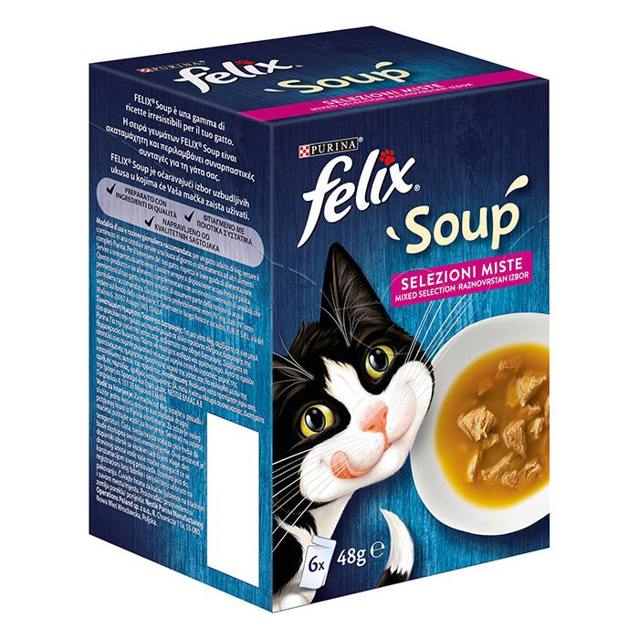 Η μικρή σκανδαλιάρα γάτα σας θα αγαπήσει τη γεύση του νόστιμου ζωμού και δεν θα μπορεί να αντισταθεί στα ζουμερά κομμάτια. Κάθε φακελάκι Felix Soup της δίνει την απαραίτητη ενέργεια για να συνεχίσει ακάθεκτη τις σκανταλιές της και χωρίς πρόσθετες τεχνητές χρωστικές, αρωματικές ύλες ή συντηρητικά, μπορείτε να νιώθετε καλά προσφέροντάς το στη γάτα σας. Προσθέστε νοστημιά στην καθημερινότητα της γάτας σας με τις ακαταμάχητες συνταγές felix soup, το τέλειο συμπλήρωμα για τη διατροφή τους.