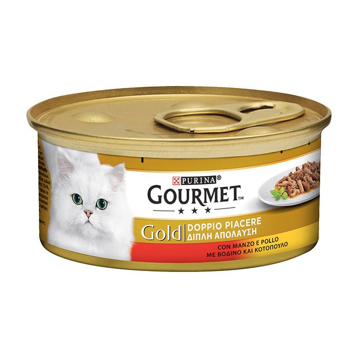 Η γάτα σας είναι ένας αληθινός γευσιγνώστης που λατρεύει να δοκιμάζει διαφορετικές συνταγές και γεύσεις. Γι αυτό το λόγο η GOURMET GOLD δημιούργησε τη σειρά Διπλή Απόλαυση: εκλεπτυσμένες συνταγές που θα προσφέρουν στη γάτα σας καθημερινά μια διαφορετική γευστική εμπειρία. Η GOURMET GOLD Διπλή Απόλαυση με Βοδινό και Κοτόπουλο είναι μία πλήρης τροφή για ενήλικες γάτες. Μία νόστιμη συνταγή με κομματάκια σε σάλτσα εξαιρετικά μαγειρεμένα θα ικανοποιήσουν και τους πιο απαιτητικούς ουρανίσκους. Διπλή Απόλαυση από την GOURMET GOLD, μια επιλογή από εξαιρετικές συνταγές που προσφέρουν μια διαφορετική γευστική εμπειρία κάθε μέρα.