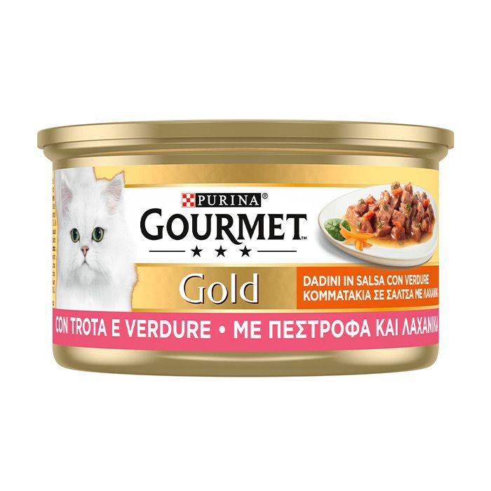 Η γάτα σας είναι ένας αληθινός γευσιγνώστης που λατρεύει να δοκιμάζει διαφορετικές συνταγές και γεύσεις. Γι αυτό το λόγο η Gourmet Gold δημιούργησε τη σειρά Κομματάκια σε Σάλτσα με Λαχανικά: εκλεπτυσμένες συνταγές που θα προσφέρουν στη γάτα σας καθημερινά μια διαφορετική γευστική εμπειρία. Η Gourmet Gold με Πέστροφα και Λαχανικά είναι μία πλήρης τροφή για ενήλικες γάτες.Τρυφέρα κομματάκια με ψάρι και λαχανικά εξαιρετικά μαγειρεμένα με την σάλτσα τους θα ικανοποιήσουν και τους πιο απαιτητικούς ουρανίσκους. Κομματάκια σε Σάλτσα με Λαχανικά από την Gourmet Gold, μια επιλογή από εξαιρετικές συνταγές που προσφέρουν μια διαφορετική γευστική εμπειρία κάθε μέρα.