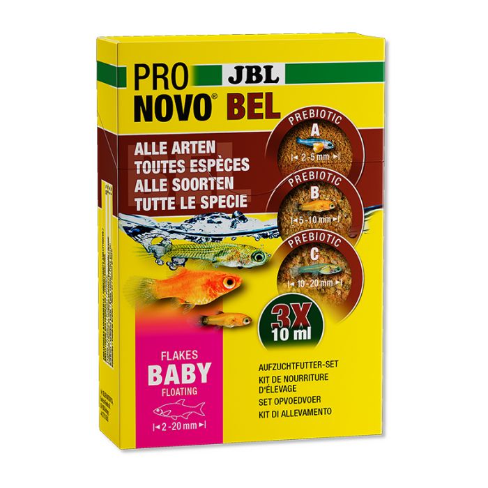 Η Jbl Pronovo Bel Flakes Baby είναι μία πρεβιοτική τροφή για νεαρά ψάριαnbsp;που βυθίζεται στο νερό: αποκλειστικές διαιτητικές ίνες στην τροφή παρέχουν στα ευεργετικά εντερικά βακτήρια τροφή για υγιή πέψη. Χρήση: οι 3 σακούλες περιέχουν τροφή αυξανόμενου μεγέθους από τροφή σε σκόνη έως μίνι νιφάδες, πάντα κατάλληλη για την ανάπτυξη νεαρών ψαριών Χαρακτηριστικά: Πολύ υψηλή αποδοχή ακόμη και σε εκλεκτά είδη ψαριών χάρη σε υψηλής ποιότητας πρώτες ύλες όπως ο σολομός, το καλαμάρι, οι γαρίδες και το σκόρδο Με την πολύ υψηλής ποιότητας φυσική ασταξανθίνη από κριλ και σπιρουλίνα, που εξασφαλίζει τέλειο σχηματισμό χρώματος στα διακοσμητικά ψάρια Αεροστεγές και φωτοστεγές