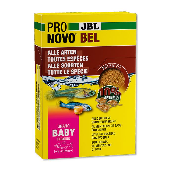 Η Jbl Pronovo Bel Grano Baby είναι μία πρεβιοτική τροφή για νεαρά ψάριαnbsp;που βυθίζεται στο νερό: αποκλειστικές διαιτητικές ίνες στην τροφή παρέχουν στα ευεργετικά εντερικά βακτήρια τροφή για υγιή πέψη. Χρήση: οι 3 σακούλες περιέχουν τροφή αυξανόμενου μεγέθους από τροφή σε σκόνη έως μίνι νιφάδες, πάντα κατάλληλη για την ανάπτυξη νεαρών ψαριών Χαρακτηριστικά: Πολύ υψηλή αποδοχή ακόμη και σε εκλεκτά είδη ψαριών χάρη σε υψηλής ποιότητας πρώτες ύλες όπως ο σολομός, το καλαμάρι, οι γαρίδες και το σκόρδο Με την πολύ υψηλής ποιότητας φυσική ασταξανθίνη από κριλ και σπιρουλίνα, που εξασφαλίζει τέλειο σχηματισμό χρώματος στα διακοσμητικά ψάρια Αεροστεγές και φωτοστεγές