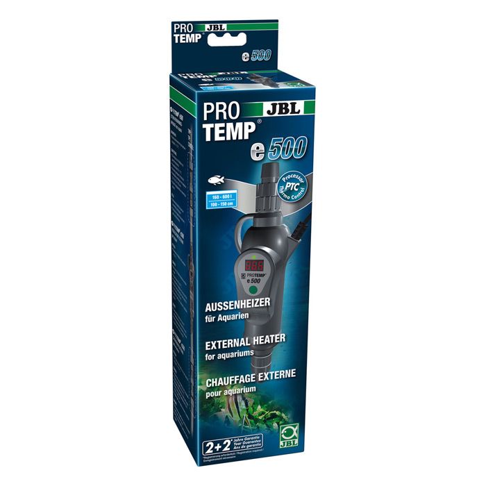 Χαρακτηριστικά: Ένδειξη LED της πραγματικής ή/και της ονομαστικής θερμοκρασίας Περιοχή θερμοκρασίας 20 – 35 °C Θερμαντήρας ενσωματωμένος στο κύκλωμα των φίλτρων Εναλλασσόμενες συνδέσεις εύκαμπτου σωλήνα για 12/16, 16/22 και 19/25 mm. Συμπεριλαμβάνεται βούρτσα καθαρισμού για το θερμαντικό στοιχείο Διακόπτης απενεργοποίησης ασφαλείας σε περίπτωση υπερθέρμανσης ή στεγνής λειτουργίας Αποθήκευση της ονομαστικής θερμοκρασίας σε διακοπή ρεύματος Εξαρτήματα και ονομασία Σύνδεση εύκαμπτου σωλήνα με κόντρα παξιμάδι (12/16, 16/22, 19/27) Σήμανση της κατεύθυνσης ροής Θηλιά ανάρτησης Πλήκτρο επιλογής Ένδειξη LED LED ελέγχου Καλώδιο τροφοδοσίας ΠΡΟΣΟΧΗ: Οι συσκευές JBL PROTEMP e300 και e500 είναι θερμαντήρες συνεχούς ροής, οι οποίοι προορίζονται για εγκατάσταση στον εύκαμπτο σωλήνα εξόδου νερού (πλευρά πίεσης) ενός εξωτερικού φίλτρου ή μιας αντλίας ανακυκλοφορίας, που βρίσκεται εκτός του ενυδρείου. Δεν επιτρέπεται ποτέ να βυθίζονται μέσα στο νερό! Αυτή η συσκευή περιέχει ένα θερμαντικό στοιχείο από γυαλί. Παρακαλούμε για το χειρισμό της με την ανάλογη προσοχή.