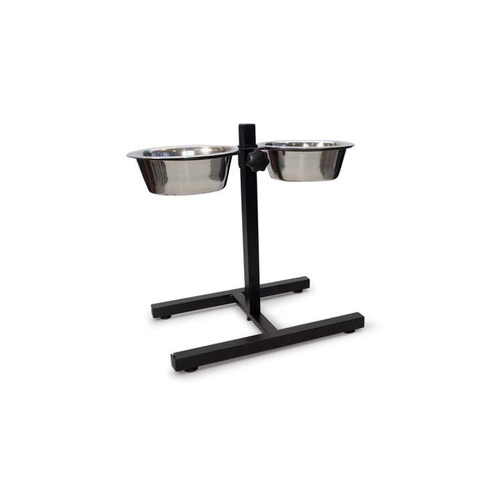 Βάση φαγητού με δυο μπολ για το φαγητό και το νερό του σκύλου ή της γάτας. Η διάμετρος κάθε μπολ είναι 20εκ. και η μεταλλική βάση του έχει ρυθμιζόμενο ύψος με μέγιστο ύψος τα 40εκ.
