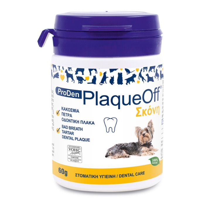 Η κακοσμία είναι μία ένδειξη ότι αντιμετωπίζει προβλήματα στοματικής υγιεινής.nbsp;Τοnbsp;Plaque Offnbsp;είναι ένας εύκολος τρόπος για να βελτιώσετε τη στοματική υγιεινή του κατοικιδίου σας. Ιδανικό για την εξάλειψη της κακοσμίας καθώς και της υπάρχουσας πλάκας και της πέτρας. Είναι ένα απόλυτα φυσικό προϊόν που περιέχει ένα πατενταρισμένο είδος φυκιού, με αποδεδειγμένα οφέλη στη στοματική υγιεινή. Μπορεί να χρησιμοποιηθεί και προληπτικά. Το 85% των σκύλων και το 75% των γατών άνω των τριών ετών εμφανίζουν ουλίτιδα, η οποία προκαλεί πόνο στο στόμα και μπορεί να επιφέρει απώλεια δοντιών. Τοnbsp;Plaque Offnbsp;είναι μια καινοτόμος θεραπεία απαραίτητη για τη στοματική υγιεινή του σκύλου σας.nbsp; Αν το κατοικίδιο σας υποφέρει από κακοσμία, η κύρια αιτία στο 80% των περιπτώσεων είναι η οδοντική πλάκα και πέτρα. Σε αντίθεση με άλλες μεθόδους ελέγχου της πλάκας, τοnbsp;Plaque Off δρα μέσω του αγγειακού συστήματος. Αποτρέπει την επικόλληση της πλάκας στα δόντια και μαλακώνει τα υπάρχοντα υπολείμματα πέτρας. Αισθητή βελτίωση παρατηρείται συνήθως την 3η εβδομάδα της θεραπείας. Πρώτο σημάδι βελτίωσης είναι η εξαφάνιση της κακής αναπνοής. Σε δεύτερη φάση η υπάρχουσα πέτρα μαλακώνει και αποσπάται με τον χρόνο Τοnbsp;Plaque Offnbsp;έχει εγκριθεί από τον διεθνή οργανισμό VOHC για επιστημονικά αποδεδειγμένα αποτελέσματα, στον έλεγχο της πλάκας και της τρυγίας. Λόγω της υψηλής περιεκτικότητας σε ιώδιο φυκιού, το προϊόν μπορεί να μην είναι κατάλληλο σε ζώα που ακολουθούν θεραπεία υποθυρεοειδισμού. Πριν την χρήση του συμβουλευτείτε τον κτηνίατρο.