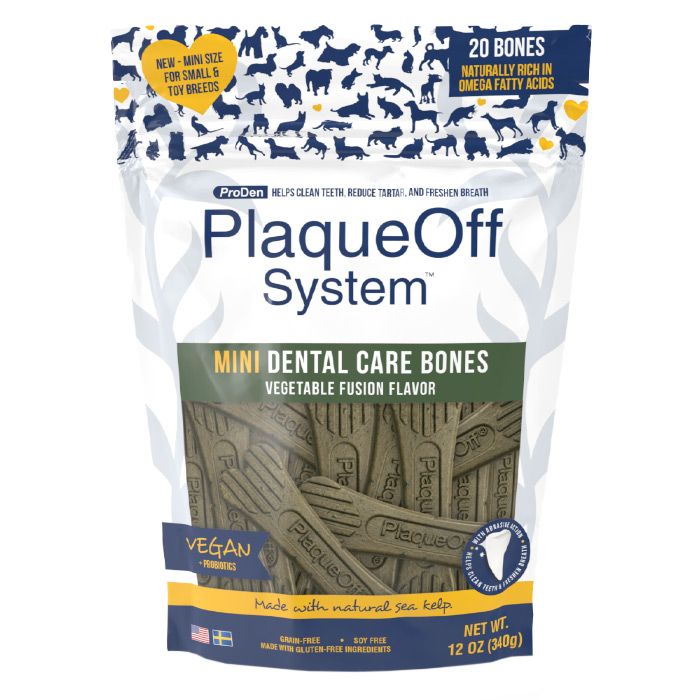 Τα ProDen Plaque off Dental Care Bones αποτελούν την πρώτη και μοναδική διπλής δράσης φόρμουλα για την στοματική υγιεινή των σκύλων που λειτουργεί 2 σε 1, μηχανικά και συστηματικά. Το εξελιγμένο σχήμα τους βοηθάει στον καθαρισμό των δοντιών και μειώνει τον σχηματισμό της πέτρας και της πλάκας. Η μοναδική φόρμουλα του ProDen Plaque off, 100% φυσικό και κλινικά αποδεδειγμένο, συνεισφέρει με βέλτιστο τρόπο στη μείωση της δυσάρεστης αναπνοής, της υπάρχουσας πέτρας και πλάκας και αποτρέπει τον αποσχηματισμό τους. Έχει σχήμα κόκκαλου ιδανικό για τον καθαρισμό των δοντιών και την καταπολέμηση της πέτρας και πλάκας καθώς διαθέτει ισχυρή δράση στη μείωση της δυσάρεστης αναπνοής. Με αυτή τη νέα προσέγγιση στην στοματική υγιεινή, ένα “Dental Care Bone” ανά ημέρα για τις μεγαλόσωμες φυλές και μισό “Dental Care Bone”nbsp; ανά ημέρα για τις μικρόσωμες φυλές, αρκεί για να βελτιώσει την στοματική τους υγιεινή! Τα “ProDen PlaqueOff Dental Care Bones” είναι ιδιαίτερα γευστικά και αποδεκτά από τους σκύλους. Το προϊόν είναι 100% φυσικό, χωρίς γλουτένη και χωρίς σιτηρά. *Η συσκευασία περιέχει 20 mini Dental Bones
