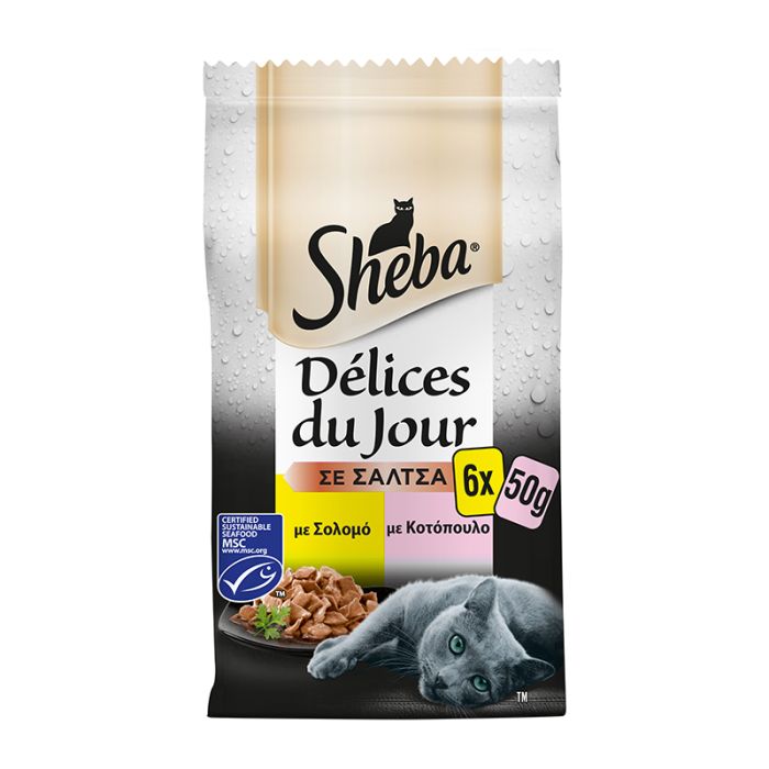 Sheba Γάτας Delices Du Jour Με Κοτόπουλο & Σολομό Σε Σάλτσα 6x50G