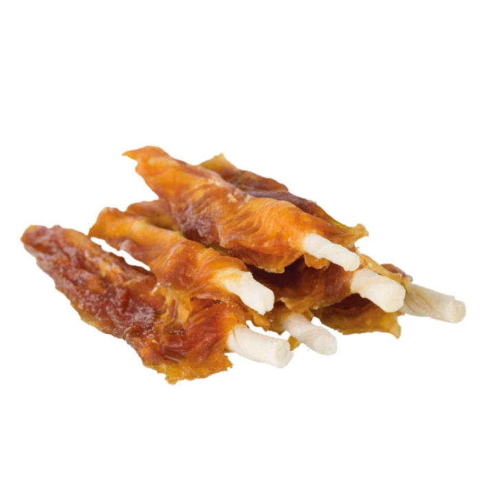 Sticks από ωμό δέρμα με επικάλυψη από στήθος κοτόπουλου, για όλους τους σκύλους. Με τις λιχουδιές αυτές ο σκύλος απασχολείται με τη διασκεδαστική διαδικασία της μάσησης ενώ ταυτόχρονα καθαρίζει τα δόντια του. Εκτός από τον καθαρισμό των δοντιών συμβάλλουν στην εκγύμναση της γνάθου και των ούλων και φυσικά στο να έχει ο σκύλος καθαρή και δροσερή αναπνοή.nbsp; Χαρακτηριστικά Sticks με επικάλυψη από στήθος κοτόπουλου Με υψηλή περιεκτικότητα σε πρωτεΐνη Χωρίς γλουτένη